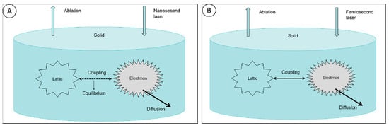 Laser-processing technology, when applied to diamond processing, can produce diamonds with high efficiency high precision. Different laser beam types have very different effects on diamond surfaces. The lasers used for diamond processing can be categorized into “hot processing” and “cold processing” lasers, according to the relationship between the laser pulse length and the size of the atomic lattice collision [36]. The most representative of these are nanosecond and femtosecond lasers. An interaction model of two typical lasers with electrons and lattices is shown in Figure 4. For diamonds, the relaxation time of the electrons and holes is 1.5 ps and 1.4 ps, respectively [37], and heat transfer occurs between the electrons and lattice when the laser reacts with the diamond. For the nanosecond laser, with a longer pulse duration, the laser energy deposited in the electrons is transmitted to the lattice within the time of irradiation of the material by the laser pulse, which leads to the heating of the material and reaches the thermal equilibrium state. There is an obvious thermal effect in the process, so it is called “thermal processing”. For the femtosecond laser, the laser pulse width is less than the time scale of electron–phonon interaction; thus, the laser energy deposited in the electrons cannot be transmitted to the ions in time, when the laser pulse irradiation has ended. At this time, the temperature of the ions is relatively low, so it is called “cold processing”.