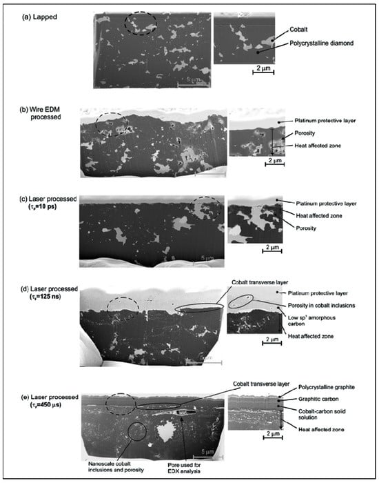 The cross-section of PCD composite was obtained by microsecond laser processing: (a) lapping; (b) wire EDM; and (c–e) laser [40].
