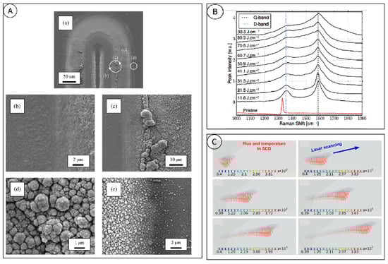 (A) SEM image of nanosecond laser processing: (a) the entire groove, (b) thin layer of debris deposition, (c) large debris particles, (d) small round particles, (e) decrease in particle size [42]; (B) Raman spectral images of machined pits under different laser fluxes [43]; and (C) heat conduction and temperature distribution in the single crystal diamond at different scanning time, in which the arrowheads indicate the conductive heat flux direction [44].