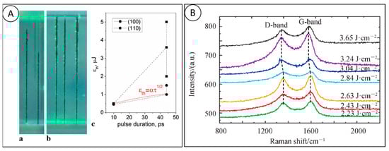 (A) Schematic diagram of nanosecond laser processing and optical picture of graphitized microstructure device. (a) longitudinal scanning processing, (b) horizontal scanning processing, (c) thresholds of bulk microstructure formation for two pulse durations and two beam directions [46]; and (B) Raman at the center position of diamond microgroove by picosecond laser ablation at different laser energies spectrum [49].