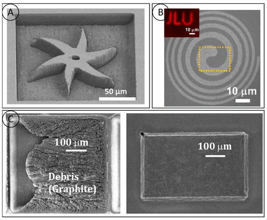 (A) SEM image of the surface of single crystal diamond processed by femtosecond laser, bending structure processed by laser pulse (energy is 1.2 mJ) [54]; (B) SEM image of diamond spiral strip structure processed by fs laser, the insertion diagram is the imaging effect; and (C) surface contrast topography of diamond processed by nanosecond laser and femtosecond laser [55].