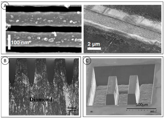 (A) SEM image of grooves obtained at a pulse energy of 72 nJ [61]; (B) side view of the diamond microchannel [38]; and (C) SEM image of microgroove prepared by nanosecond laser [62].
