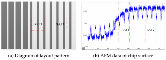 To obtain the EPL and specific weighting function described in Section 3 and verify the effect of the correction algorithm on the CMP prediction result, we designed the layout of the HKMG structure, as displayed in Figure 8. Test chips were fabricated by Semiconductor Manufacturing International Corporation (SMIC) with a subset of the process steps (to the formation of the replacement of metal gates). After the final CMP process, the chip surface profile AFM data were used to obtain the EPL and verify the effect of the density-corrected algorithm on the accuracy of the model prediction. The layout parameters are listed in Table 1.