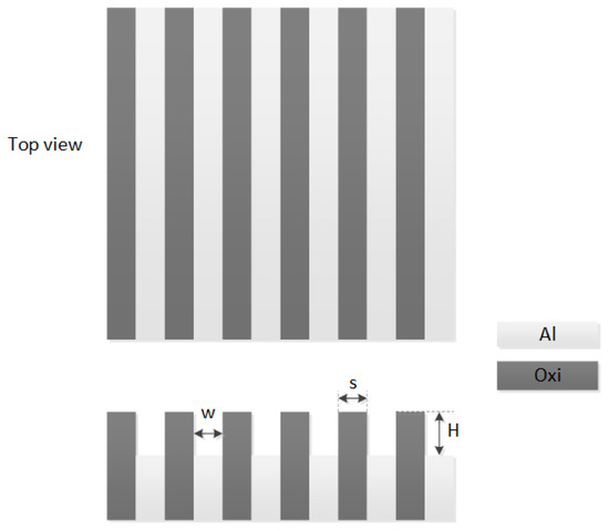 and denote the pressure carried in the higher and lower regions of the grid, respectively. H is the step height and represents the average difference between the higher and lower regions. is the average load of the abrasive pad. is the proportion of the graphical area of the higher region, also known as graphical density. is the fitting parameter related to the line width (w) and space (s). In Figure 3, w, s, and H are demonstrated visually. After obtaining the pressure distribution, the MRR is calculated using the Preston formula [16], as indicated in Equation (3). In Equation (3), K, , and represent different fitting factors. P represents the pressure calculated using Equations (1) and (2), and V represents the relative speed between the pad and wafer in the CMP process.