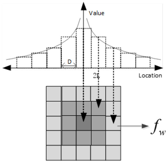 The weighting function is discretized as the corrected weight of the grid density. Because the value of the weight function is infinite at , the value of the weighting function at is used as the value of the center grid weight after discretization. The weights of the surrounding grid are calculated in the order of , where n depends on . Weighting correction to the density is essentially a convolution process, and the EPL determines the size of the convolution kernel. After determining the weights, the relationship between the weighting function and convolution kernel is displayed in Figure 7. The corrected effective density of the grids can be expressed as Equation (9). In Section 4, we introduce the layout design for measuring the EPL.