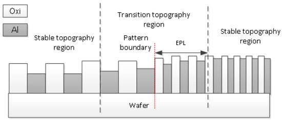 As indicated in Figure 8, layout areas with different parameters were marked with serial numbers from L1_1 to L2_4. In this study, we selected the transition topography from L1_1 to L1_2 as indicated in Figure 9 to introduce our experiment. From the topography data, it is clear that the topography at the center of the array is stable, which means that the height of the Al gate does not fluctuate in the general trend. However, the topography of the transitional region between the arrays indicates an apparent trend, which is caused by the influence of different patterns on adjacent arrays. Therefore, the range of the transitional topography region reflects the range of interactions between grids, which is equal to the EPL. Figure 10 displays the relationship between the range of the transitional topography region and the EPL.