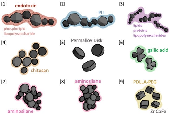 Nanoparticle Schematic. Illustrations of the 9 nanoparticles discussed in this study. Grey interior composed of Fe3O4 (with the exception of [9], as labeled) exterior composed of designated coating.