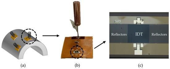 In previous studies, surface acoustic wave (SAW) temperature sensors were connected to their corresponding antennas via PCB boards [,,]. Typically, FR-4 is used as the substrate for PCB, which exhibits poor thermal conductivity, high hardness, and limited environmental adaptability. FR-4 material has a certain moisture absorption property, and prolonged exposure to humid environments may cause material expansion and affect the performance and stability of the PCB. In recent years, research has explored the integration of flexible printed circuit boards (FPCBs) with surface acoustic wave (SAW) devices, where pre-designed interdigital transducer (IDT) electrodes on FPCBs are pressed onto piezoelectric substrates using mechanical fixtures [,]. However, this method imposes significant limitations on the width of the IDT electrodes. In the study, the width of the IDT electrodes is 50 μm, and its operating frequency only reaches 19.9 MHz, which appears inadequate in the current trend of high-frequency electronic device development. Additionally, this manufacturing method has limitations in terms of production speed and scale, and it is incompatible with CMOS technology. In contrast, the direct patterned fabrication of interdigital transducers on piezoelectric substrates is more mature, expedient, and efficient. It is worth noting that achieving precise alignment of two IDTs in experimental operations poses a technical challenge. It requires relying on rotating microchannels or manually adjusting the IDTs, which not only complicates the operation but may also introduce errors, potentially affecting the frequency response characteristics of the devices.