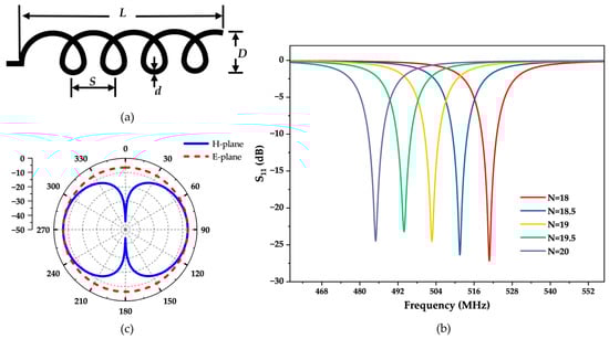 Antennas are crucial components in passive wireless sensor systems. In this study, we selected a helical antenna owing to its simple structure, compact size, low cost, and ease of integration into various devices or systems. Figure 2a shows the basic structural parameters of the helical antenna. D represents the diameter of the helical antenna, d is the diameter of the antenna wire, S is the pitch, and L is the total length of the antenna. The number of turns (N) is also an important parameter of the helical antenna, typically adjusted to modulate the antenna’s frequency.