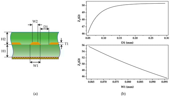 (a) Embedded Coplanar Waveguide with Ground 1B1A. (b) The variation of impedance (Z0) with the spacing between the ground line and the signal line (D1) and the linewidth (W1).