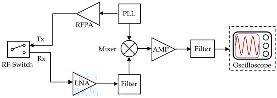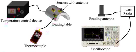 The experimental setup for wireless temperature sensing mainly consists of sensors, interrogation antennas, transceiver circuits, and oscilloscopes. A commercially available antenna with high gain and a working bandwidth of 470 MHz–530 MHz is used for reading the circuit. Figure 4 shows the system diagram of the wireless reading circuit [,,,]. At present, the reading circuit of wireless passive resonant sensors is mainly divided into time–domain sampling and frequency–domain sampling. The basic principle of time–domain sampling is to generate pulse signals using a frequency source, transmit them to the outside via the antenna to excite the sensor, and then detect and analyze the feedback echo signal; the resonant frequency information of the sensor is obtained. The time–domain sampling method can read the signal quickly and satisfy the need for fast signal acquisition, so this research adopts the time–domain sampling method. Then, we use an oscilloscope to convert the time–domain signal into the frequency–domain signal and read the frequency value of the echo signal. By the correspondence between temperature and frequency, we can calculate the temperature value of the object to be measured.
