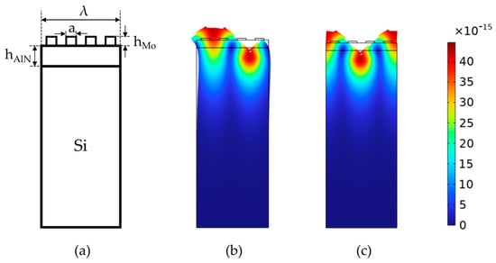 Simulation component. (a) Two-dimensional periodic model of the Mo/AlN/Si structure. (b) The antisymmetric modes of the Rayleigh wave. (c) The symmetric mode of the Rayleigh wave.