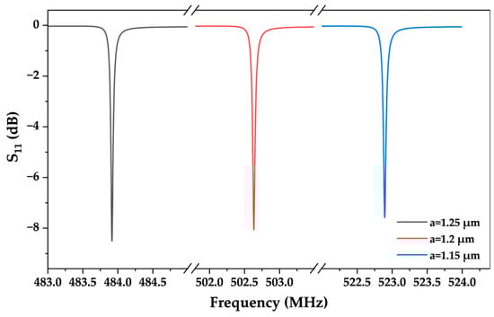 In the simulation of the model, the propagation modes of SAW are observed via the analysis of characteristic frequencies. Figure 6b,c illustrates two different vibration modes of Rayleigh waves, where Figure 6b represents anti-resonance and Figure 6c represents resonance. According to the simulation results, the energy in the Rayleigh Wave is mainly concentrated in the 1–2 wavelength range below the solid surface, so it is highly sensitive to temperature changes [,]. Furthermore, the frequency range and step length are added to calculate the frequency response of the model under excitation, and the reflection parameter S11 is obtained. Figure 7 shows the S-parameter curves of three SAW devices with different interdigital widths, where the interdigital widths are 1.15 μm, 1.2 μm, and 1.25 μm, and the corresponding central frequencies are 522.902 MHz, 502.639 MHz, and 483.918 MHz, respectively.