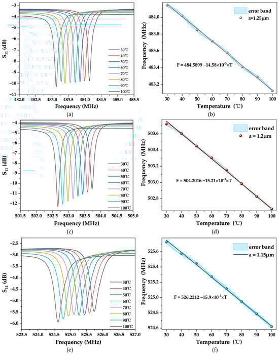 After testing the reflection parameter S11 of the SAW resonator with three different finger widths at room temperature, we placed the SAW resonators on a heating table and utilized a VNA to measure the trend of their S-parameter curves with temperature variations. The experimental temperature range was from room temperature to 100 °C. Figure 8 illustrates the offset results of the S11 curves of the three SAW resonators with temperature variations. It can be observed that the S11 curves are shifted to the left, and the operating frequency decreases as the temperature increases. There is a clear negative correlation between frequency and temperature. We conducted two heating–cooling experiments separately for each of the three SAW sensors. At each temperature point, four frequency values were obtained, and their average was calculated as the operating frequency at that temperature. Additionally, we calculated the standard deviation and set it as the error bars. According to Figure 8b,d,f results, it can be observed that the operating states of the three devices were relatively stable, and multiple experimental results did not show significant fluctuations.