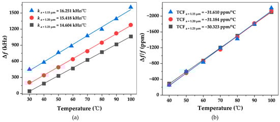Based on the experimental results, we observe some regularities: for SAW resonators with different finger widths, narrower finger widths correspond to higher sensitivity S. Although as the finger width decreases, the TCF also increases, the growth rate is relatively slow. This indicates that SAW resonators with higher operating frequencies can effectively enhance sensor sensitivity, but TCF is influenced to a certain extent by the parameters of the piezoelectric material [].