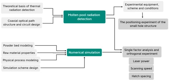 The studies mentioned above have made many breakthroughs and solved many key problems in the SLM process. In this study, a set of radiation monitoring systems of molten pools has been designed for SLM. The device uses a photodiode to detect molten pool radiation through a coaxial optical path structure, locks the strongest band of molten pool radiation through a narrowband filter, and then converts the radiation intensity into an analog voltage by using a special amplifier circuit with a composite structure. The voltage is sampled and communicated through an embedded microprocessor to realize online monitoring of SLM molten pool radiation. Figure 1 is the research framework of this study. This research will be based on the self-developed detection method printing experiment, and the numerical simulation method will be used to verify the correctness of the detection results. This study will carry out single-parameter influence experiments and orthogonal experiments with multiple parameter combinations to explore the influences of different process parameters on the radiation of the molten pool during the SLM process. In addition, the localization experiment involving the small hole structure will be carried out to verify that the proposed method can quickly and effectively locate the given small hole structures during the printing process.