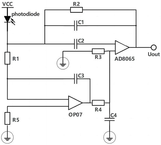 As shown in Figure 3, the photoelectric detection pre-circuit is a special circuit structure that combines two types of operational amplifiers, and forms the effect of cross-resistance amplification for the weak current signal output by the PIN photodiode. Figure 4a,b show the display of the photoelectric detection device.