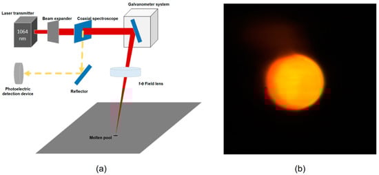 Figure 5. (a) Coaxial optical path structure diagram; (b) molten pool detected by coaxial optical path.