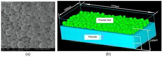 The powder bed of the selective laser melting process is a discrete particle model with certain distribution rules. In this study, the discrete element method (DEM) [29] was used to establish a powder bed model approximating the actual particle distribution. The modeling data of the powder bed is derived from the actual powder data in Table 1, which brings the simulation process closer to the actual printing process. Figure 7 shows the actual electron microscope observation diagram of the powder bed and the modeling diagram of the powder bed. By comparison, it can be found that the particle distributions of the two are very similar. The powder bed model established by simulation in this paper is a 1000 × 400 × 240 μm powder bed, which is a single-layer powder bed model.