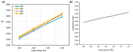 Figure 8. (a) The influence of laser power on the radiation signal (AD) of the molten pool; (b) the numerical simulation result.