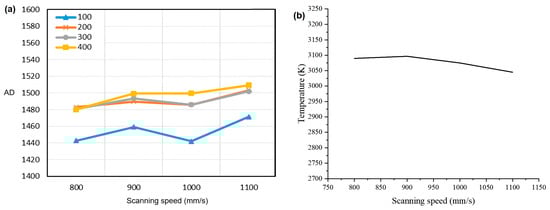 As can be seen from Figure 9a,b, when the laser scanning speed is 800 mm/s, the temperature and radiation of the molten pool are both low. Because the size of the molten pool is large in the case of low scanning speed, the liquid metal in the molten pool can rapidly absorb heat and transfer it to the surrounding areas, so the temperature of the molten pool’s center is not high. When the scanning speed is increased to 900 mm/s, the time taken for laser action is reduced, the heat conduction capacity of the molten pool is reduced, and the temperature of the molten pool is increased. With the increase in scanning speed, the laser input takes the dominant position, and the molten pool’s temperature decreases with the increase in scanning speed. The molten pool radiation result is inconsistent with the result of the molten pool temperature simulation after 1000 mm/s. At this time, the increase in the molten pool radiation detection value is mainly because the number of molten pools in the coaxial field of view will increase with the increase in scanning speed. Therefore, when the speed is higher, the molten pool radiation detection device detects the superposition value of multiple molten pools’ radiation.