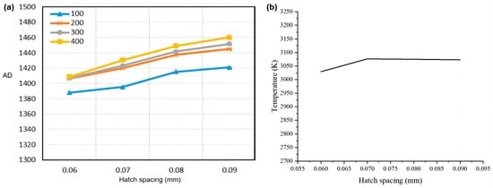 Figure 10. (a) The influence of hatch spacing on the radiation signal (AD) of the molten pool; (b) the numerical simulation result.