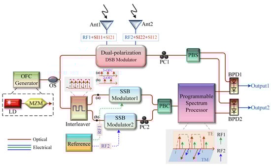 Figure 1 presents a schematic diagram of the proposed microwave photonic SIC scheme for the IBFD communication system applied to the narrowband 2 × 2 MIMO antenna system. The system consists of an OFC generator, an optical beam splitter (OS), an interleaver, a dual polarization double sideband (DSB) modulator, two SSB modulators, two polarization controllers (PCs), an optical polarization beam splitter/beam combiner (PBC/PBS), a programmable spectral processor, and two BPDs. In the structure shown in Figure 1, RF1 and RF2 represent the desired received signals of receiving antenna 1 and receiving antenna 2, respectively. SI11 represents the interference signal leaked from transmitting antenna 1 to receiving antenna 1, while SI12 represents the interference signal leaked from transmitting antenna 1 to receiving antenna 2. Similarly, SI22 represents the interference signal leaked from transmitting antenna 2 to receiving antenna 2, and SI21 represents the interference signal leaked from transmitting antenna 2 to receiving antenna 1.