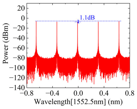 where is the insertion loss of the MZM; is the modulation index; and is the DC bias angle of the MZM. represents the first kind of n-order Bessel function, and under small-signal modulation, the high-order sidebands are ignored. When is established by adjusting and , five optical comb teeth with equal output amplitude can be obtained, as shown in the following equation: