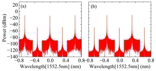First, the modulation index, , and DC bias angle, , of the MZM are adjusted to output a five-line OFC signal, as shown in Figure 2. The maximum amplitude fluctuation between the five comb teeth is about 1.1 dB, and the overall amplitude is relatively flat. As precise optical amplitude attenuation adjustment is required in the subsequent programmable spectrum processor, the amplitude fluctuation here will not affect the final SIC effect. Then, the above five-line OFC is input into the interleaver for channel division, and the three-line OFC and two-line OFC are obtained as shown in Figure 3a,b, respectively. To conform to the parameters of the real device, the optical filter type is configured as rectangular in the simulation, resulting in a channel isolation of approximately 35 dB. Notably, according to the working process of the programmable spectrum processor in Figure 1, the initial five-line OFC can be replaced by a four-line OFC without affecting the system function. Therefore, the three-line OFC shown in Figure 3a can also be replaced by a two-line OFC.