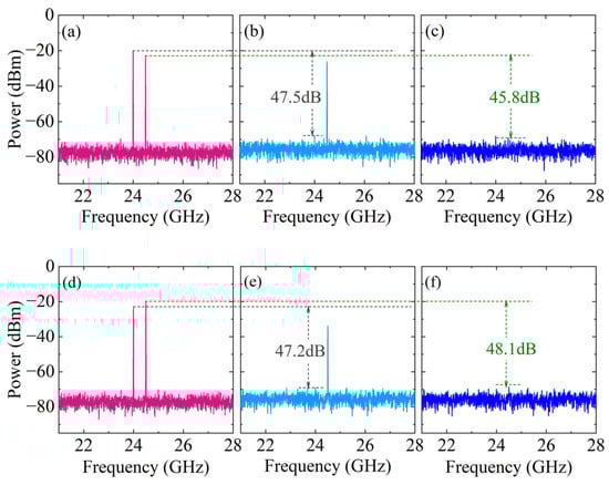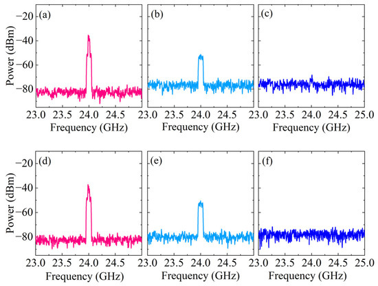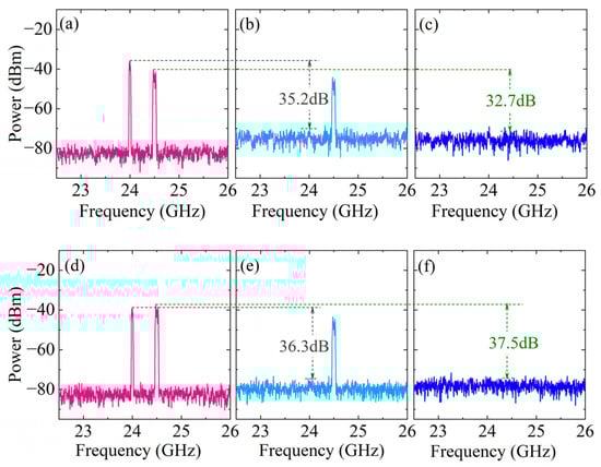 Then, the narrowband SIC characteristics of the system are verified. The SI signal received by antenna 1 is changed to a 16QAM signal with a carrier frequency of 24 GHz, a power of −20 dBm, and a bandwidth of 30 MHz. The SI signal received by antenna 2 is changed to a 16QAM signal with a carrier frequency of 24.5 GHz, a power of −23 dBm, and a bandwidth of 60 MHz. The power of the reference interference signal is −10 dBm, and the other parameters are the same as the received interference signal. Based on the previous parameters, the amplitude attenuation coefficient and phase shift are adjusted appropriately; Figure 5a–c show the output spectra before and after SIC at antenna 1. After dual-path SIC processing, the narrowband SIC depths are 35.2 dB and 32.7 dB. Figure 5d–f show the output spectrum before and after SIC at antenna 2. The narrowband SIC depths are 37.5 dB and 36.3 dB, respectively. Since the reconstruction path of the reference interference signal is more complex than the receiving path and introduces more attenuation, the noise floor is slightly higher after optical power compensation by EDFA.