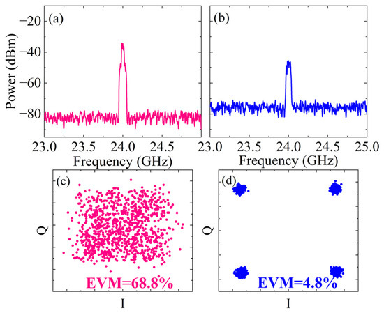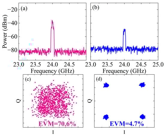 Finally, in order to verify the receiving performance of this solution, the desired received signal is added based on the parameter settings in Figure 6. Among them, the carrier frequency is 24 GHz, the power is −30 dBm, the bandwidth is 70 MHz, and the modulation format is 4QAM. The desired signal is mixed with the received SI signal and then modulated. The output spectrum before and after SIC at antenna 1 is shown in Figure 7a,b. After dual-path SIC processing, only the desired received signal remains in the spectrum. The constellation diagram before SIC is shown in Figure 7c. When signals of multiple modulation formats are mixed, the demodulator may erroneously demodulate some symbols into symbols of another modulation method, leading to a misjudgment of constellation points. Consequently, the constellation diagram appears disorganized, with an error vector magnitude (EVM) of 68.8%, and the communication system cannot work correctly due to complete bit errors. The spectrum after SIC is shown in Figure 7b, where both the interference signal introduced by antenna 1 itself and introduced by antenna 2 to antenna 1 are effectively eliminated, leaving only the desired 4QAM signal. The demodulator has achieved correct demodulation, making the four constellation points visible. Figure 7d shows that the EVM is only 4.8%, far below the communication standard requirements. This indicates that the proposed SIC method enhances the demodulation ability of the desired signal at the receiving terminal, enabling it to identify and demodulate the desired signal. Consequently, this reduces error rates, thereby enhancing communication quality and reliability more effectively.