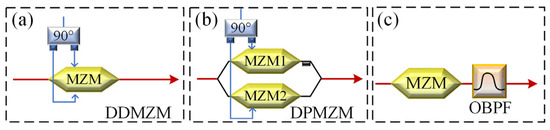 Electro-optic modulation is one of the essential components of microwave photonic systems, and its characteristics largely determine the performance of microwave photonic signal processing modules. In this study, the electro-optical modulation process of the reference signal was implemented based on the SSB modulation method. According to [28], conventional SSB modulation methods based on lithium niobate modulators can be divided into three types: those based on DDMZM, those based on DPMZM, and those based on optical filtering. The specific implementation principle is shown in Figure 9.