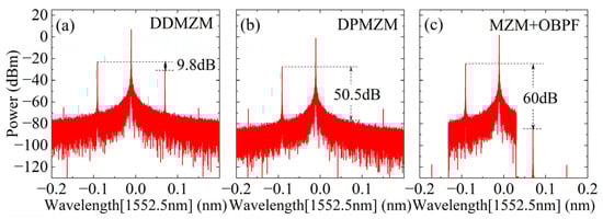 Three SSB modulation spectra (a) based on DDMZM; (b) based on DPMZM; and (c) based on optical filter.
