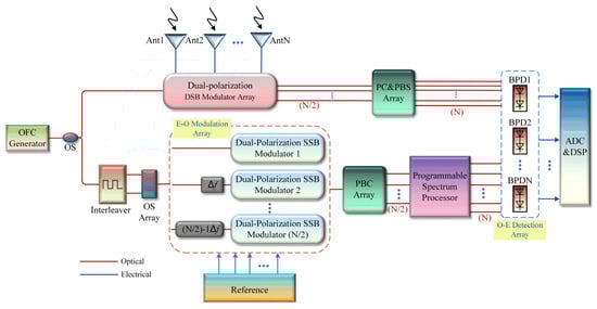 Massive MIMO technology has been widely studied and aims to mitigate the interference and fading effects during transmission, thereby improving a system’s adaptability to varying channel conditions. The proposed scheme has only been theoretically derived and simulated for 2 × 2 MIMO application scenarios. Although the functionality has been preliminarily confirmed, the scheme faces challenges amidst the evolving trend of antenna array expansion in the future. Therefore, for the N × N MIMO scenario, a possible microwave photonic SIC method is shown in Figure 11. Firstly, received N-channel signals are modulated in N/2 dual-polarization DSB modulators, and subsequently demultiplexed through PC and PBS arrays to obtain received N-channel optical signals. In the lower reference branch, (N/2-1) optical frequency shifter modules (frequency shift amount of ) are used to frequency-shift N/2 three-line OFC and two-line OFC and then modulate the reference interfering signals in N/2 dual-polarized SSB modulation modules. N/2 dual-polarization reference interference signals with different optical frequencies are inputted to the programmable spectrum processor to perform N-channel optical amplitude attenuation and phase shift adjustment. Finally, after N BPDs, pure N-channel receiving signals can be obtained. The structure shown in Figure 11 builds upon the framework presented in Figure 1, extending the pivotal modules into an array configuration. Thanks to the utilization of polarization multiplexing technology, the overall complexity of this scheme has been halved.