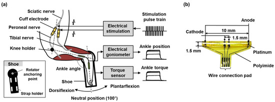Animal experiments were performed using three 2–2.5 kg male New Zealand white rabbits. The animals were kept and handled in accordance with the regulations of the Institutional Animal Care and Use Committee of the Korea Institute of Science and Technology (approval number: KIST-2019-111). For nerve cuff electrode implantation, recruitment modeling, and joint position control in vivo, the animal was anesthetized with a Zoletil- Rompun cocktail (1 mL/kg, intramuscular injection; Zoletil, Virbac, NSW, Australia; Rompun, Bayer Korea, Republic of Korea). The animal experimental procedure has been modified in our previous study [12]. The cuff electrode was implanted through an incision in the thigh, from the vertebral column to the knee. The biceps femoris and semitendinosus were identified and retracted to expose the tibial and peroneal nerves above the branch from the sciatic nerve, and the electrode was positioned on each nerve (Figure 1a). Considering the sciatic nerve dimensions, the cuff electrode was fabricated by depositing platinum on a thin polyimide film substrate, and it consisted of a rectangular electrode (0.25 mm wide, 7 mm long) with a self-curling shape (Figure 1b). For electrical stimulation, a pair of two-center platinum ring electrodes was used as the cathode, and two other pairs of outer electrodes were used as the anode. Each pair of electrodes was connected to an electrical stimulator (AM 2200, A-M Systems, WA, USA) through medical wires (CZ 1209, Cooner Wire, CA, USA). Furthermore, we applied a flexible electrode in this study to demonstrate its applicability to recent peripheral nerve interfaces, where electrodes were used in our previous work [20].