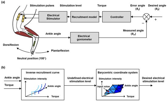 To demonstrate the feasibility of the joint position control produced using surface-based inverse recruitment, the ankle position was controlled while the surface-based inverse recruitment was applied to a closed-loop FNS system composed of a stimulation-cuff electrode, an electrical stimulator, the surface-based inverse recruitment, a proportional–integral–derivative (PID) controller, and a goniometer (Figure 2a). To control the joint position, the measured ankle angle was fed to the PID controller as a feedback signal. The stimulation level was then adjusted to minimize the error between the desired and measured angles. The cuff electrode was positioned on both the tibial and peroneal nerves to elicit ankle angle movements using an electrical stimulation train. The implemented stimulation electrode and the other experimental apparatus were identically positioned, as described in Section 2.1 and Section 2.2. The PID controller calculated the muscle force from the error angle by comparing the differences between the desired and measured angles obtained from the goniometer. The calculated torque was then converted into a stimulation level using a surface-based inverse recruitment curve. The calculated stimulation level was used to modulate the amplitude of the stimulation pulse train through an electrical stimulator to elicit the ankle position. The PID controller is defined as the vector u(t) as:
