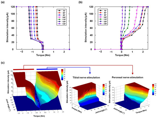 The visualized surface-based inverse recruitment model is shown in Figure 3. To construct the model, the electrical stimulation-induced isometric muscle force was measured at different initial ankle angle positions with each stimulation site of the tibial and peroneal nerves (Figure 3a,b). In general, the inverse recruitment curves showed a monotonic increase in each initial joint position while increasing the stimulation intensities and muscle force. Specifically, for the recruitment curve at an ankle angle of 70°, a steep slope was observed in peroneal nerve stimulation (Figure 3a,b). In addition, the slopes decreased with increasing initial joint positions (Figure 3b). As the initial ankle angle increased, the slope of the inverse recruitment curve became steeper in the tibial nerve plot, where the maximum torque decreased. In addition, in the peroneal nerve stimulation, the slope of the inverse isometric recruitment curve became less steep with increasing initial ankle angle, and the maximum torque increased. These results were also observed in other rabbit experiments. In the experiments, the neutral position was set to 100°. To decrease the initial angle successively in the range 100–80°, the center of the inverse isometric recruitment curve must be shifted leftward; however, the ankle angles increased step-by-step from 100° to 130°, and the center of the inverse isometric recruitment curve shifted leftward. The surface-based inverse recruitment curve for the full range of motion is shown in Figure 3c, which is composed of the recruitment curves for the tibial and peroneal nerves.
