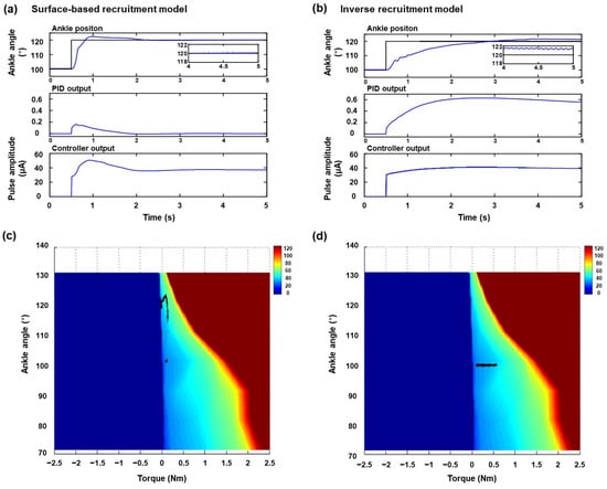 Representative results of ankle position control in plantarflexion at 120°: steady-state responses of (a) surface-based inverse recruitment model and (b) inverse isometric recruitment curve, and corresponding controller trajectories output during ankle-position control in (c) surface-based inverse recruitment model and (d) inverse isometric recruitment curve.