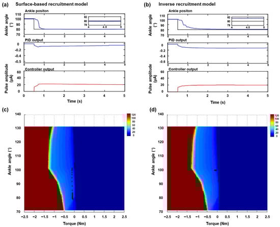 Representative results of ankle position control in dorsiflexion at 80°: steady-state responses of (a) surface-based inverse recruitment model and (b) inverse isometric recruitment curve, and corresponding controller trajectories output during ankle-position control in (c) surface-based inverse recruitment model and (d) inverse isometric recruitment curve.