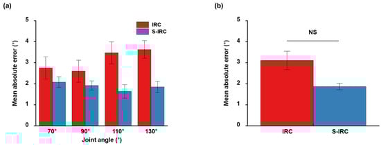 Mean absolute errors of ankle-position control: (a) mean absolute errors were evaluated by different inverse recruitment methods at different ankle positions (70°, 90°, 110°, and 130°), and (b) average of mean absolute error in every joint angle position at inverse recruitment and surface inverse recruitment curve, respectively. Statistical analysis was performed using one-way ANOVA with Tukey’s multiple comparison test (NS (not significant) p > 0.05).