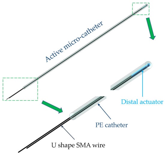 Microcatheters capable of active guidance have been proven to be effective and efficient solutions to interventional surgeries for cardiovascular and cerebrovascular diseases. Herein, a novel microcatheter made of two biocompatible materials, shape memory alloy (SMA) and polyethylene (PE), is proposed. It consists of a reconfigurable distal actuator and a separate polyethylene catheter. The distal actuator is created via embedding U-shape SMA wires into the PE base, and its reconfigurability is mainly dominated by the shape memory effect (SME) of SMA wires, as well as the effect of thermal mismatch between the SMA and PE base. A mathematical model was established to predict the distal actuator’s deformation, and the analytical solutions show great agreement with the finite element results. Structural optimization of such microcatheters was carried out using the verified analytical model, followed by fabrication of some typical prototypes. Experimental testing of their mechanical behaviors demonstrates the feasibility of the structural designs, and the reliability and accuracy of the mathematical model. The active microcatheter, together with the prediction model, will lay a solid foundation for rapid development and optimization of active navigation strategies for vascular interventions.