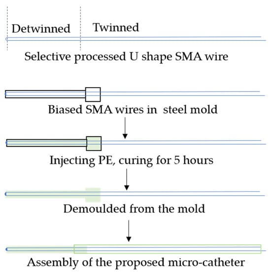 The typical manufacturing process of the proposed microcatheter in this paper is illustrated in Figure 3. First, the distal part of the SMA wire undergoes a tensile stress treatment to complete the detwinning process, while the remaining part is maintained in the twinning martensite phase. Then, the SMA wire is biasedly placed in a linear steel mold with an inner diameter of less than 1 mm. Next, liquid PE is injected into the mold and left to cure for four hours. Afterward, the cured PE base, along with the detwinned SMA wire, can be pulled out of the mold using a tensile testing device. Finally, by assembling the distal actuator with a separate PE catheter, a prototype of the designed active microcatheter can be obtained.