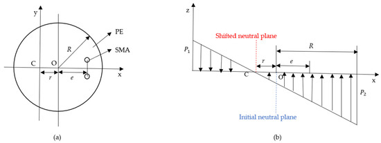 The compressive stress induced by the austenitic phase transition in biased SMA wires can contribute to the significant bending deflection of the PE base. Note that the neutral plane of the cross-section of the tip actuator shifts away from the neutral plane of the PE base. Herein, we propose a prediction method for determining the neutral plane’s shift. As seen in Figure 4a, structural parameters of R, e, and r represent the radius of the PE cross-section, the vertical distance between the center of the cross-section and the line of the SMA wire’s center, and the offset distance of the neutral plane, respectively. Moreover, the analysis of the stress distribution across the cross-section of the distal actuator is schematically depicted in Figure 4b. The maximum tensile stress and compressive stress at the edge of the cross section are denoted and , respectively. The symbols and represent the offset of the neutral plane and the stress change rate of the cross-section with the distance from the center of the circle, respectively.