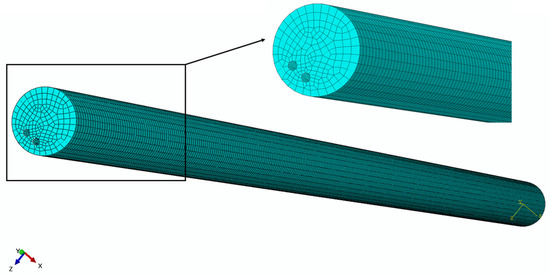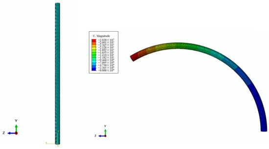 In this section, the mathematical model is verified using the finite element method (FEM). The distal actuator is simplified as a PE base embedded with two shape memory alloy wires, and its deformation capability is simulated using the ABAQUS finite element simulation software. The material properties required for the simulation are given in Table 1. It is important to point out that a negative coefficient of thermal expansion (CTE) is introduced to describe the thermal contraction due to the SME. The constraints between the PE base and SMA wires of the finite element model are set as tie constraints, and its boundary conditions are assumed as one end fixed and the other end free. To incorporate the temperature–displacement coupling, an appropriate thermal field with the same temperature as the austenite finish temperature of the SMA is loaded on the finite element model.