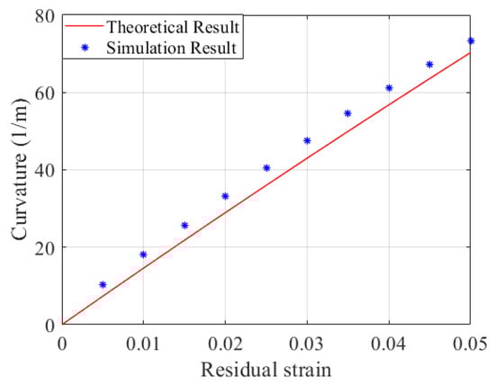 Given that the tip part of the U-shaped SMA wire at the free end has little impact on the deformation of the distal actuator, the structure of the SMA wire is simplified to a PE matrix embedded with two SMA wires in the parametric study. As shown in Figure 8, when the residual strain of SMA wire increases from 0 to 5%, the curvature of the distal actuator also increases. The simulation results given by finite element models show great agreement with the theoretical solutions. The errors between the theoretical and simulation results can be partly explained by mesh and ideal constraint settings in the finite element modeling.
