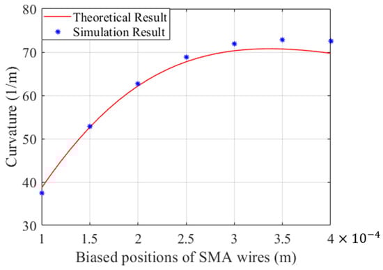 The biased position of the SMA wire can also dramatically affect the deflection of the distal actuator. In this part, a PE base with a constant radius of 0.5 mm is employed and embedded into the PE base. Expected curvatures of the distal actuator regarding the biased positions of SMA wires were investigated and are drawn in Figure 9. The theoretical results given by the analytical model reveal that the curvature initially increases and then gradually decreases as the distance between the SMA wires and the center of the PE base increases. This trend is consistent with the simulation results obtained by finite element models, which also demonstrates the reliability of the proposed mathematical model for predicting the bending of the distal actuator. It is obvious that the maximum curvature occurs when an SMA wire with a diameter of 0.3 mm is embedded into the PE base with a diameter of 0.5 mm. Moreover, it is also worth noting that the errors between the theoretical and simulation results grow with the biased position of the SMA wire, which can be partly attributed to meshing settings.