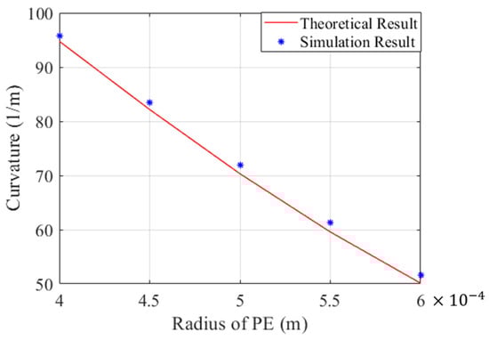 In addition to the residual strain and biased position of the SMA wire, determination of the optimal radius of the PE base for narrow and complex vessels is also critical. In this part, a SMA wire with a diameter of 0.3 mm is selected for embedding into the PE base, and the influence of the diameter of the PE base on the curvature of the distal actuator is discussed. The theoretical results obtained by the mathematical model, as well as the simulation results acquired from the finite element mode, are drawn in Figure 10. The conclusion can be safely drawn that the curvature of the distal actuator decreases with regard to the increase in the diameter of the PE base. The high agreement between the theoretical and simulation results also verifies the accuracy of the mathematical model for rapid prediction and optimization of the distal actuator of the microcatheter.