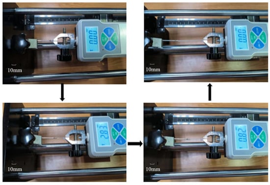 During the demolding process, it can be observed that the tensile force applied to the distal actuator initially increases and then decreases once the pulling force exceeds the peeling force between the PE base and the steel mold, as illustrated in Figure 11. The unit of the dynamometer is Newton, and the displacement measurement device on the tensile test device is measured in millimeters. It is also worth pointing out that the loading speed should not be too fast to avoid damaging the distal actuator. In this study, a single-step displacement increment per second of the tensile test device was used to measure the tensile speed, which is recommended not to exceed 0.5 mm/s to avoid damage to the distal actuator. Once the loading speed of the tensile stress increases to beyond 0.5 mm/s, the adhesion between the SMA wire and the silicone rubber is too weak to keep the stable driving of the distal body. Therefore, it is necessary to properly control the loading speed during the machining process to ensure that the distal actuator can be reliably removed from the mold.