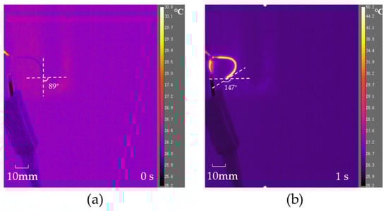 The prototype of the proposed microcatheter can be assembled by combining a matched PE catheter with the distal actuator, which is demolded from the steel mold during the fabrication process described above. The deformability of the distal actuator plays a key role in the development and operation of active microcatheter. In this part, an experiment was conducted to validate the deformation ability of the distal actuator by applying a constant current to the SMA wire of the distal actuator. The thermal field and deformation were detected in situ using an infrared camera (FLIR A655sc), and thus the relationship between the deflection of the distal actuator and the real-time temperature distribution across the distal actuator was obtained.