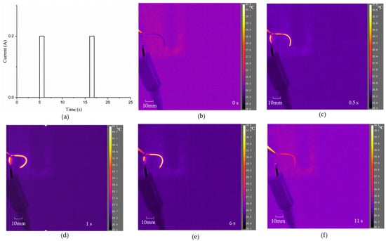 In situ electro-thermal cyclic test on the distal actuator: (a) current loading; (b–f) reconfiguration process during a cyclic test.